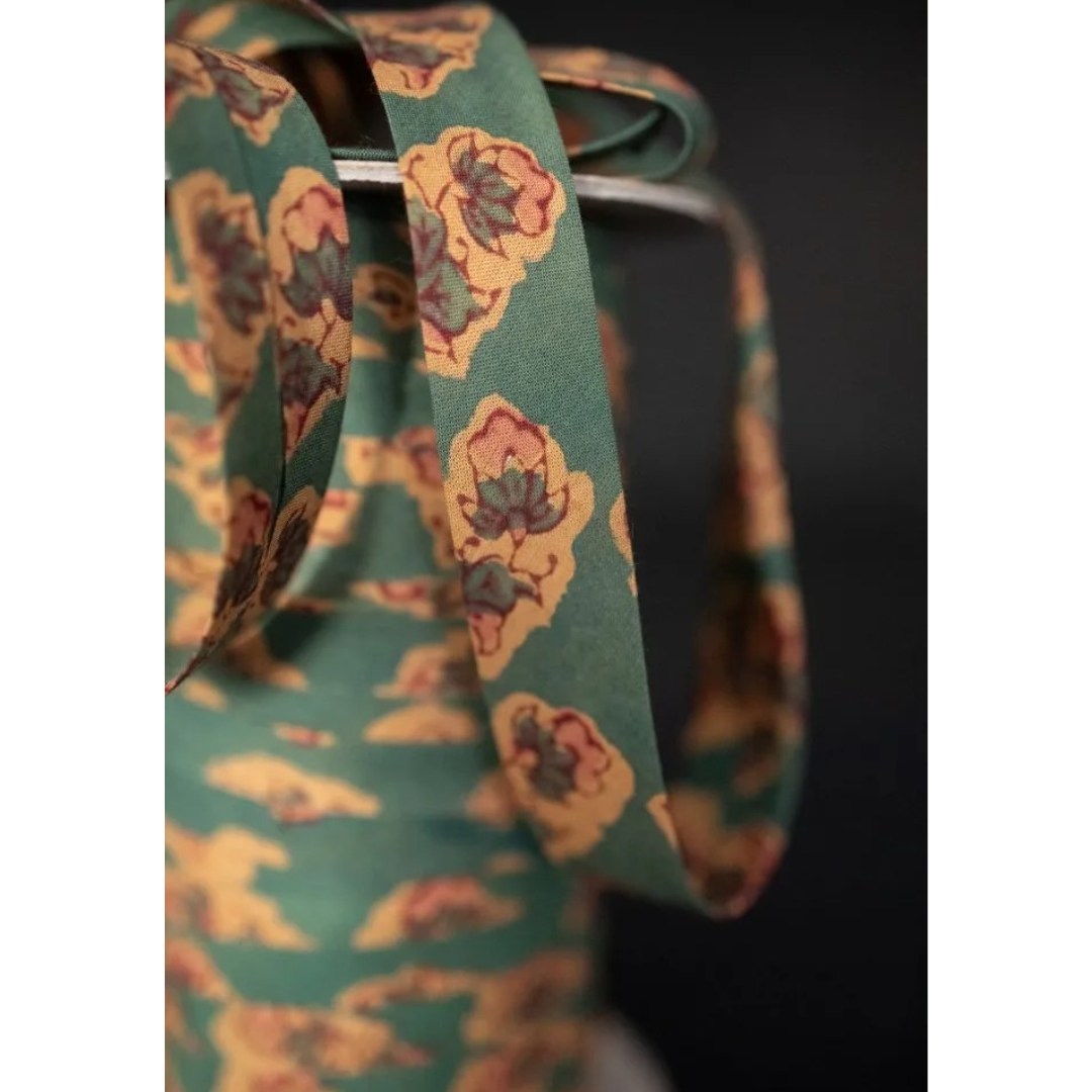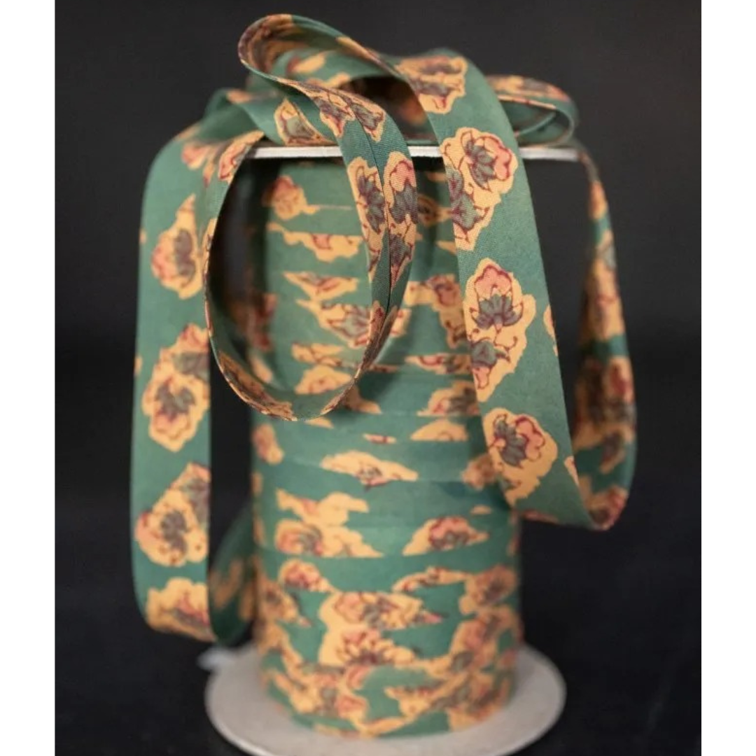 A 2cm bias binding made from Indian handloom fabric. It's a floral indian block print on an sea green background. Perfect for Hong Kong seams and finishing the edges of a quilted jacket or vest.