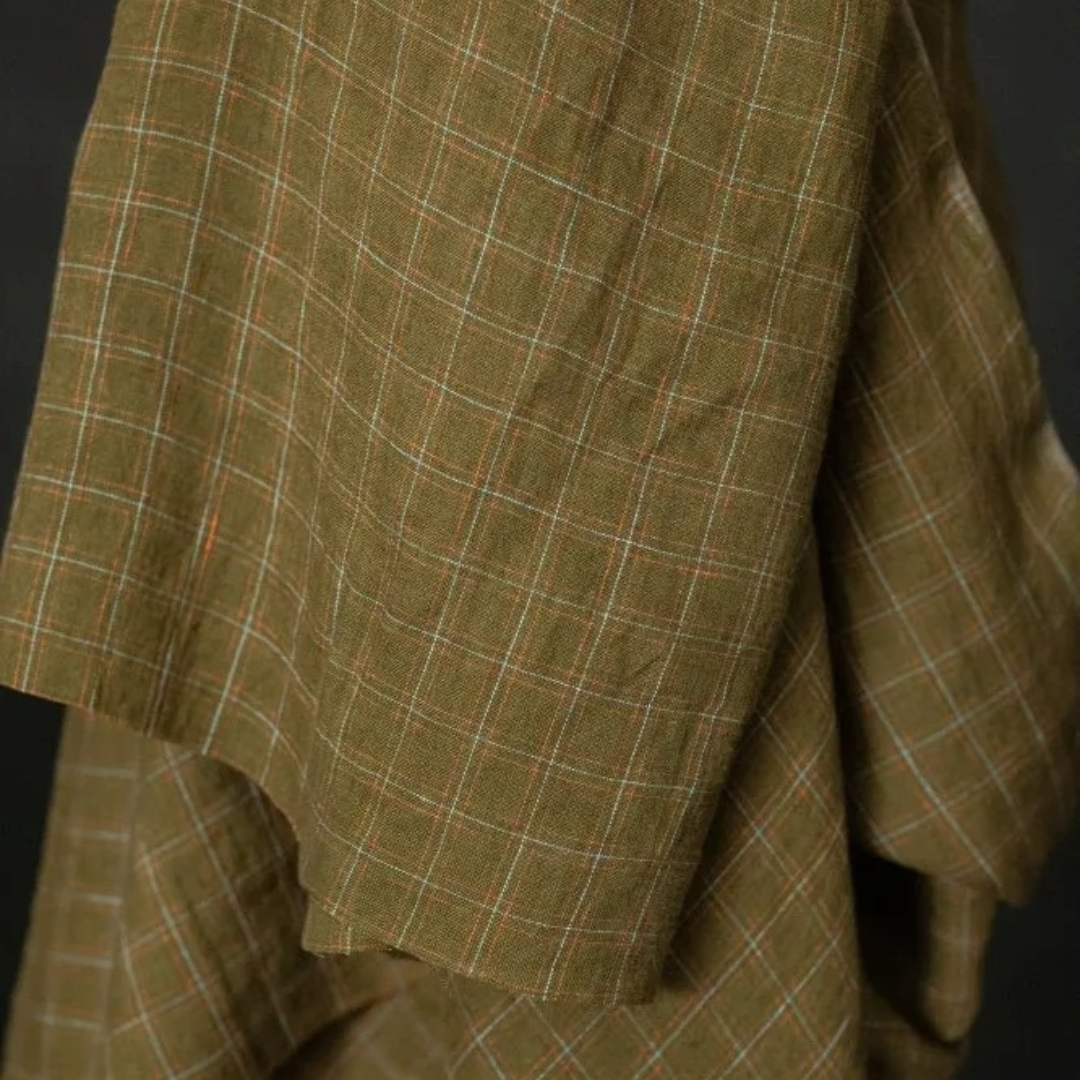 A khaki green linen with a fine zingy orange and aqua check.