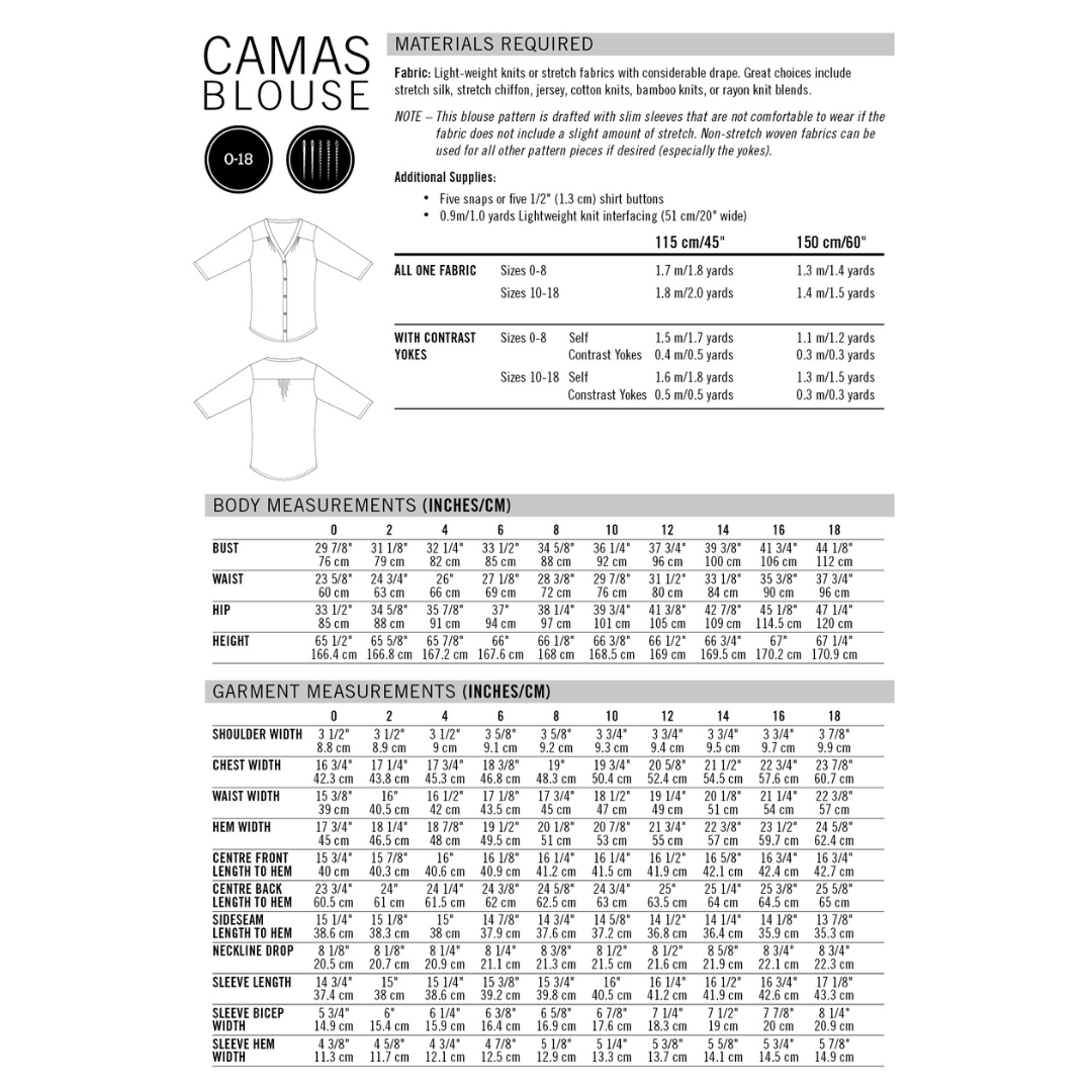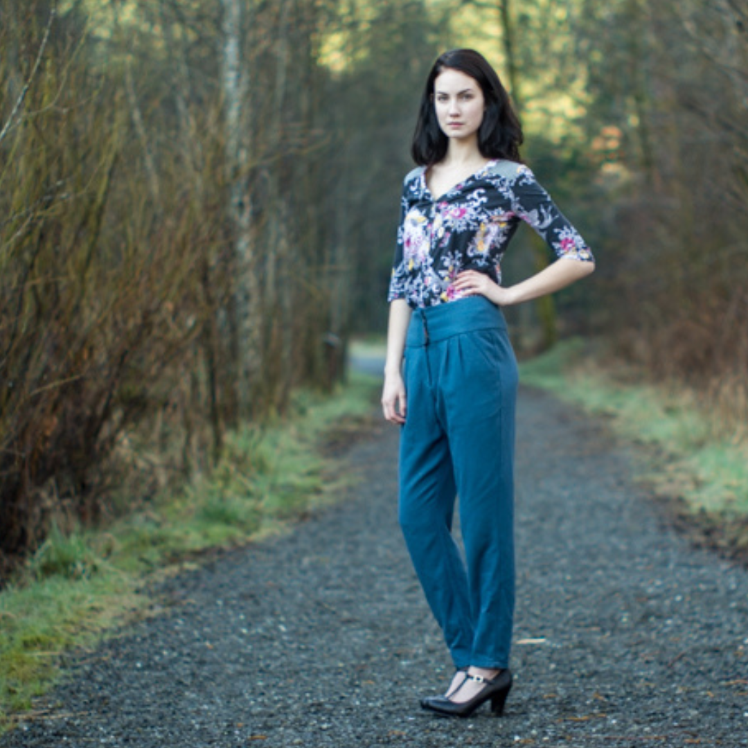 The gathers create a flattering shape that is loose enough to float over the body rather than cling to it.  The delicately curved hem can be tucked into trousers and skirts or can be left loose to float over skinny jeans.  The slim sleeves end just below the elbow to create the perfect multi-season blouse.  Instructions detail how to create a variety of closures - learn how to add buttonholes to a knit placket, add snaps or create a pull over blouse and skip button holes entirely.  Fabric requirements are included for both a colour blocked blouse and a blouse made from one fabric.
