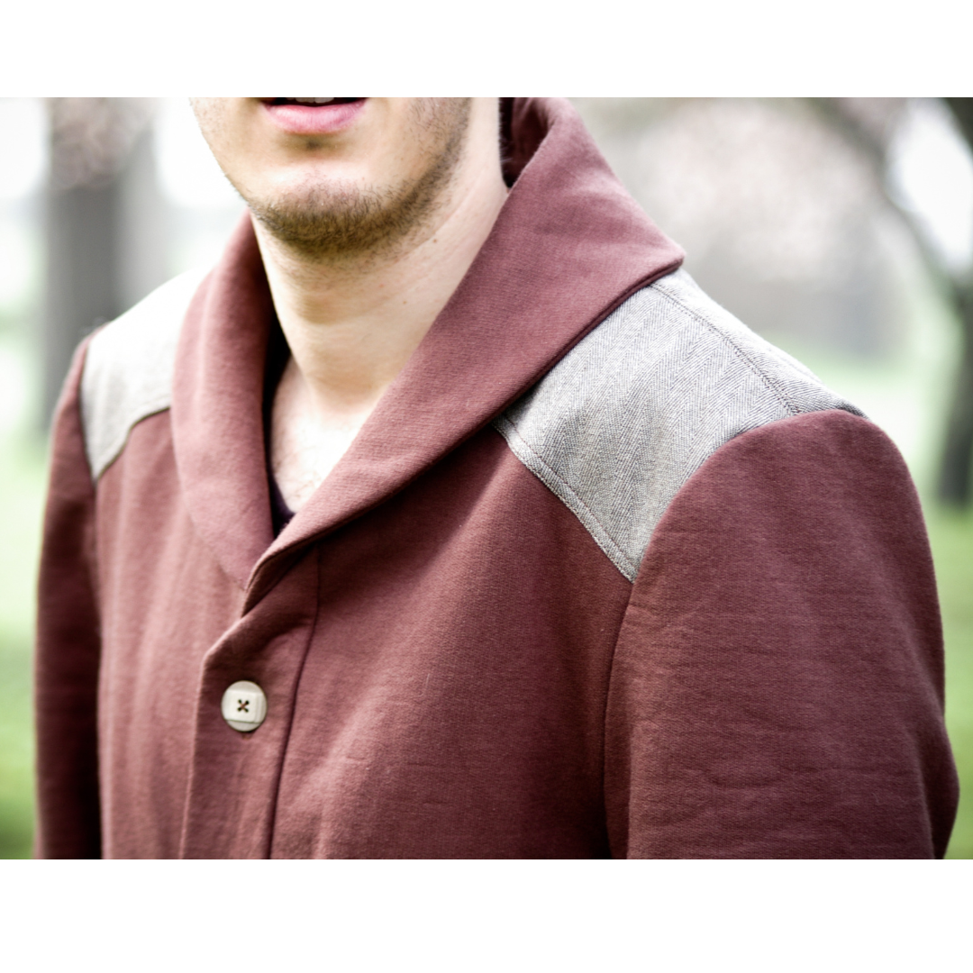 For men who would like to stay cozy but look stylish - this shawl collar cardigan can look trendy or classic depending on the fabric choice. The sweater is slim fitting with long cuffed sleeves and a flattering fold-over shawl style collar.