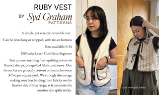 Each month, we’ll be sewing up one of our most beloved patterns (Jan 15th - Feb 15th, Syd Graham - Ruby Vest) — and giving you the chance to join in. Think of it as a little motivation to light a fire under your bum, get that project finished, and (for once!) be rewarded for it. Has anyone ever given you a prize for sewing before?